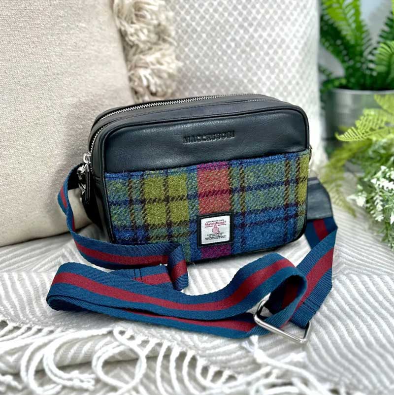 Deze Harris Tweed cameratas is ontworpen met twee interne ritsvakken voor al je essentiële spullen, een extern ritsvak en een open vak met een magnetische sluiting.