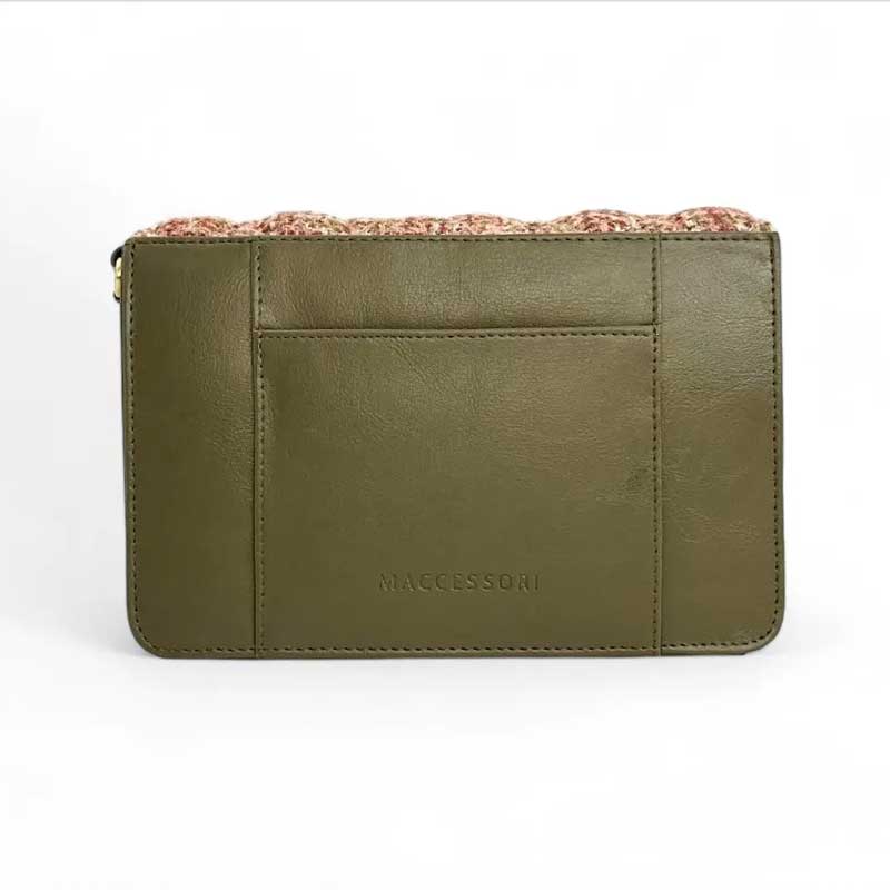 Deze schoudertas is gemaakt van Harris Tweed, heeft een doorgestikte klep en een open vak aan de achterkant, evenals een veilig ritsvak aan de binnenkant.