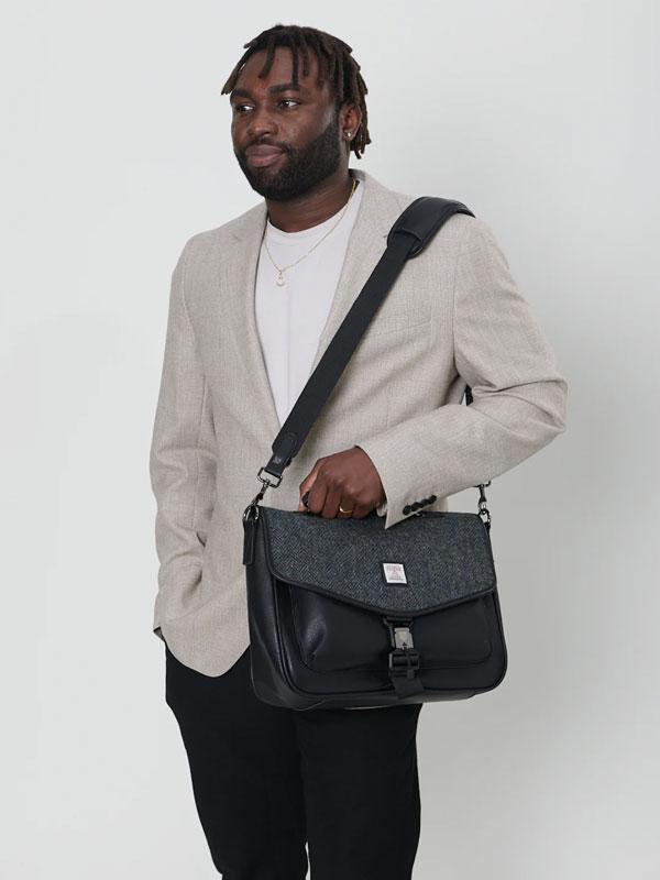 Maak kennis met de laptoptas. Gemaakt van duurzaam microvezelleer en afgewerkt met een authentiek Harris Tweed®-deksel, is dit stijlvolle ontwerp een must-have voor elke garderobe.