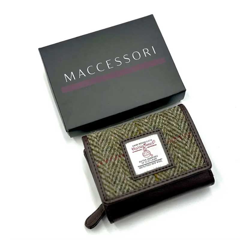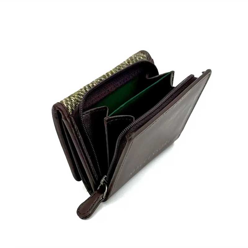 Onze trifold purse is verkrijgbaar in negen Harris Tweed-kleuren. De afwerking van het veganistisch leer verschilt afhankelijk van de gekozen Harris Tweed-kleur: